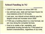 On the Department of Education website their is a PowerPoint presentation explaining the new funding formula. Slide number two shown below shows how the CEIFA (or school funding law) has not been followed by the state since the 2001-2002 school year and that state aid has been frozen to school districts since then.